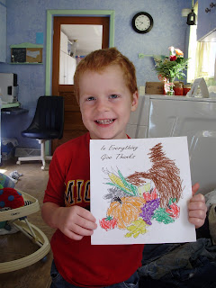 In Nathan's preschool art class they wanted were trying to teach him the difference between coloring lightly and coloring darker. This is a Thanksgiving picture where he was coloring DARK. He was very proud of his artwork so I thought we'd post the process here.